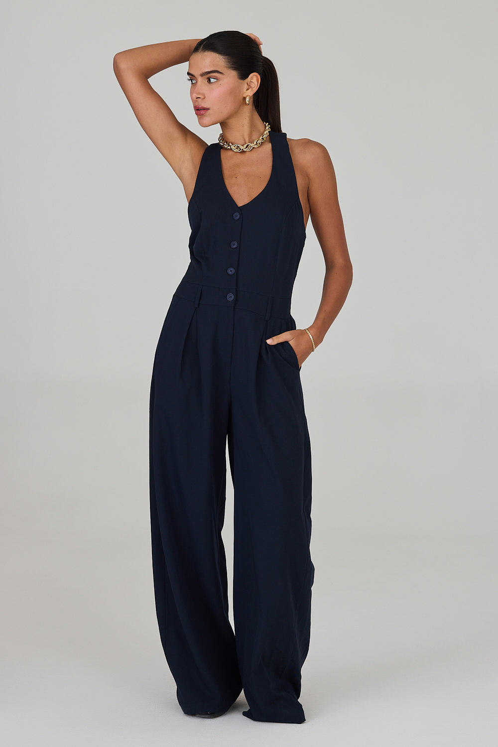 אוברול קלאסי מחויט בגזרת גופייה עם כפתורים בחזית, מחשוף וי עמוק ומכנס רחב באורך מלא. מגיע בשלושה צבעים: כחול נייבי ,קרם ושחור. מתאים ללוק ערב אלגנטי עם טוויסט מודרני.