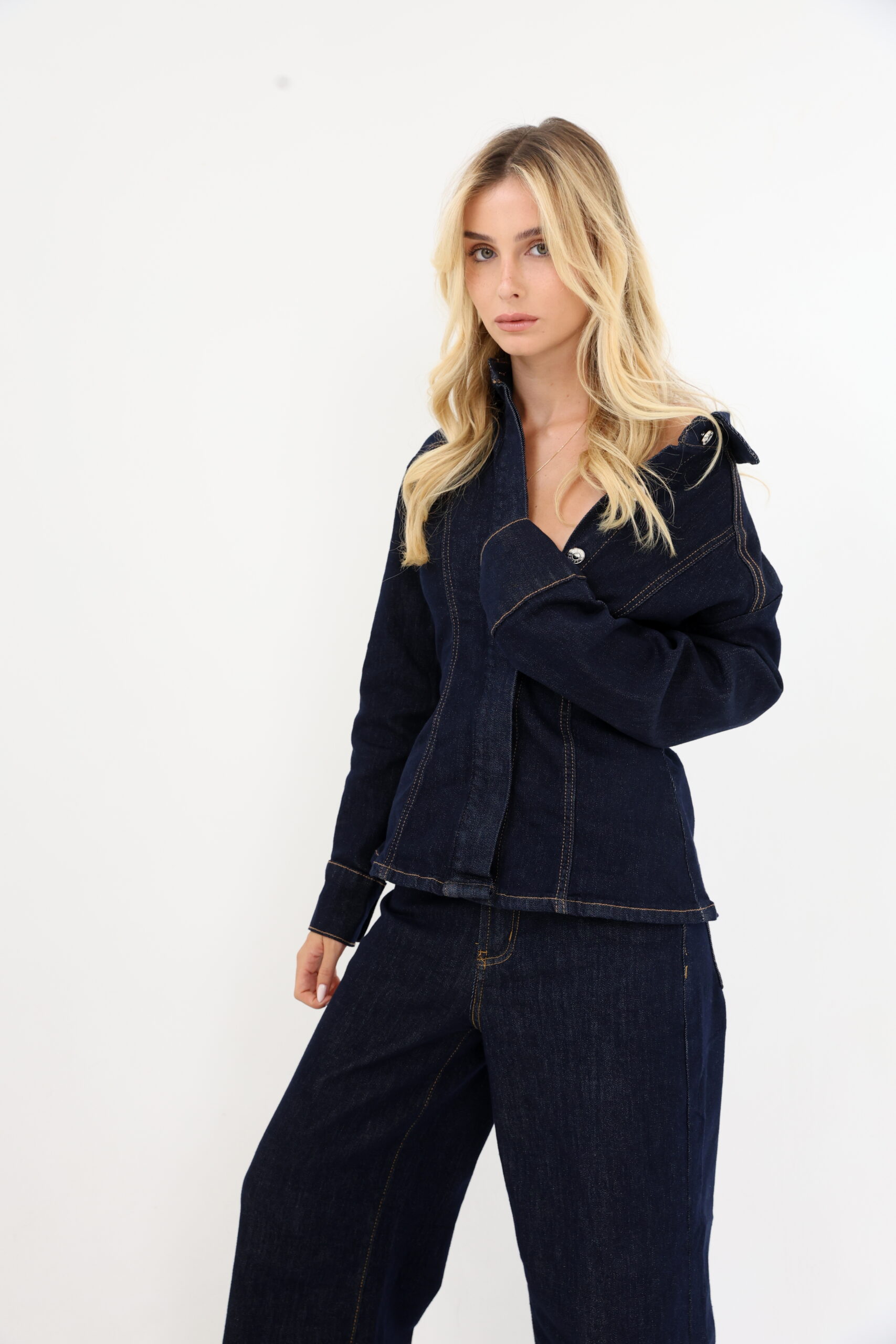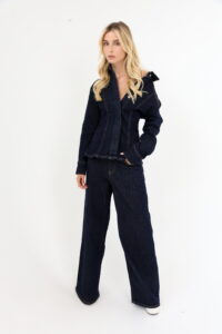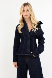 ג'קט ייחודית בגזרה מחויטת. ג'קט ג'ינס כהה עם תפרים בולטים ליצירת מראה מובנה ומחמיא