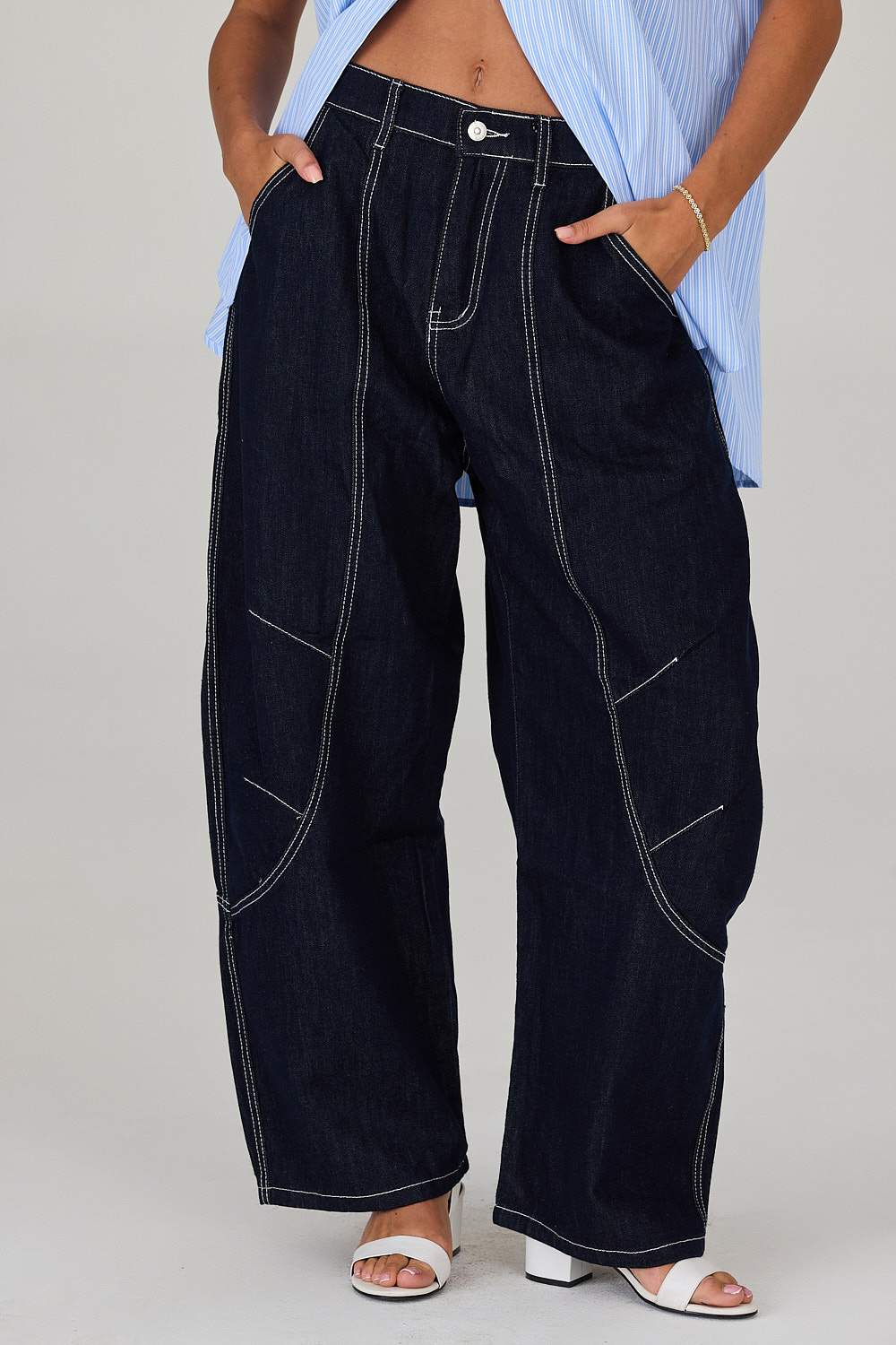 ג'ינס בגזרת באגי רחבה ונוחה, בגוון כחול כהה עם תפירה קונטרסטית לבנה שמדגישה את המבנה הייחודי.