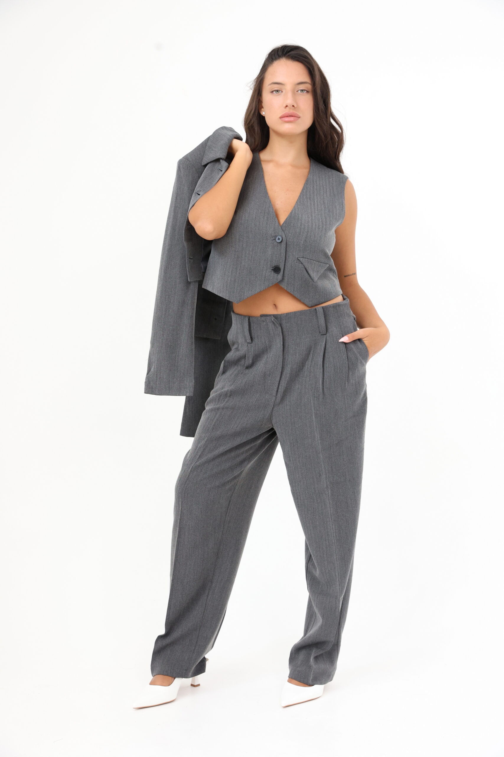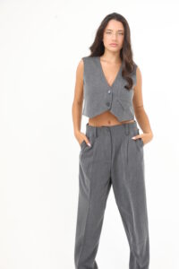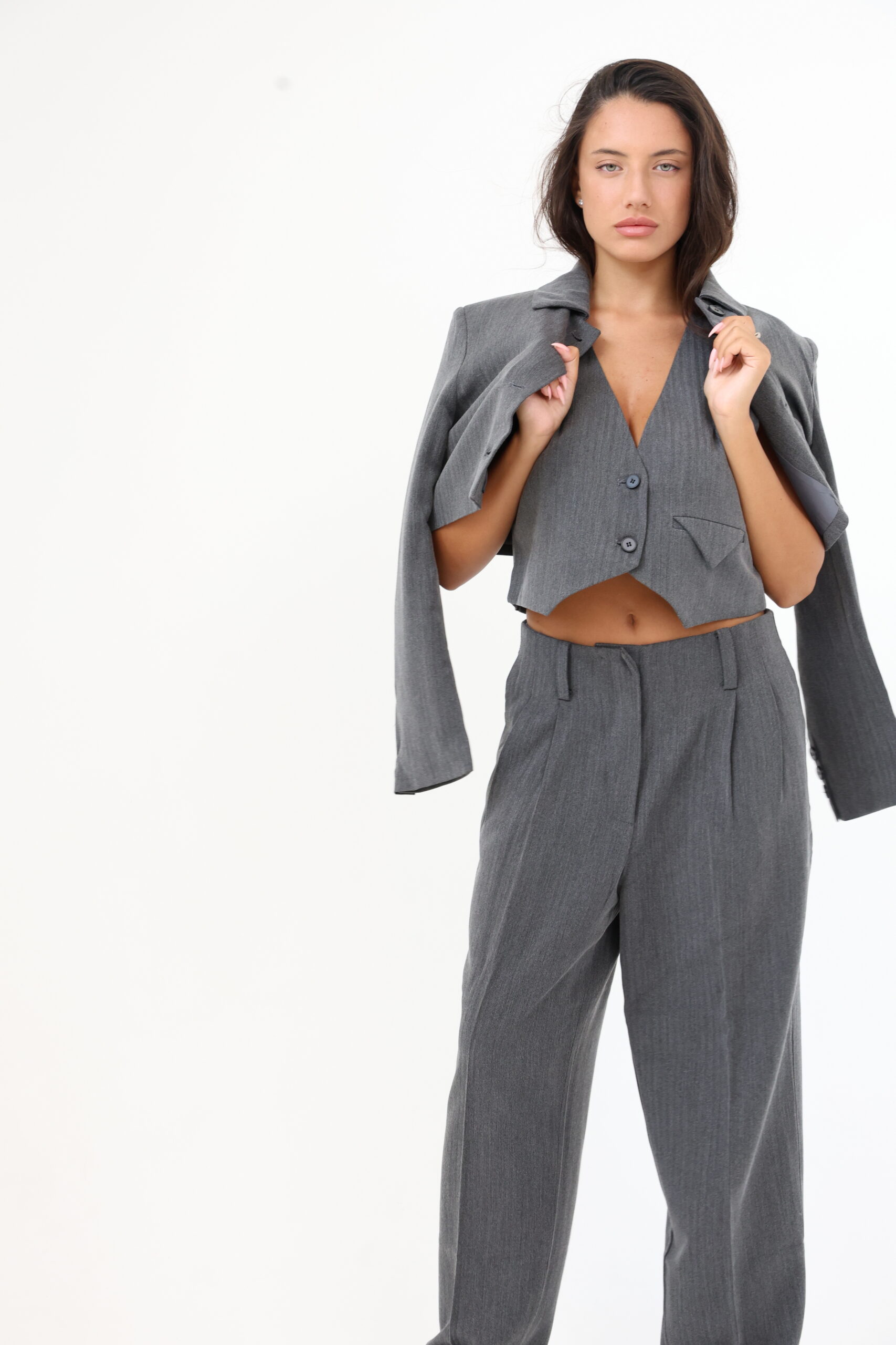 חליפת שתי חלקים אפורה בסגנון מחויט. וסט קצר בגזרת V עם כיס דקורטיבי וכפתורים בחזית, משולב עם מכנסיים בגזרה גבוהה ורחבה עם כיסים צדיים.