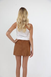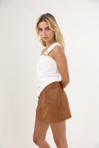 חצאית מיני בדמוי זמש בגזרה מחויטת, עם מראה רך ומעודן. החצאית מעוטרת בשני כיסים קדמיים דקורטיביים, המודגשים בתפרי עיטור ושרוכים עם ניטים מתכתיים לסטייל ייחודי ובולט.