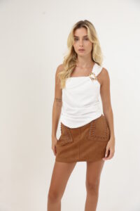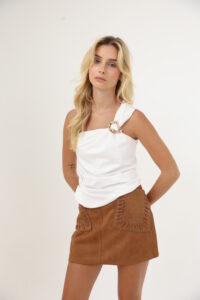 טופ אסימטרי בגזרת כתף אחת, עשוי בד חלק עם כיווצים עדינים. מעוטר אבזם מתכת זהוב בכתף למראה אלגנטי ומודרני.