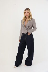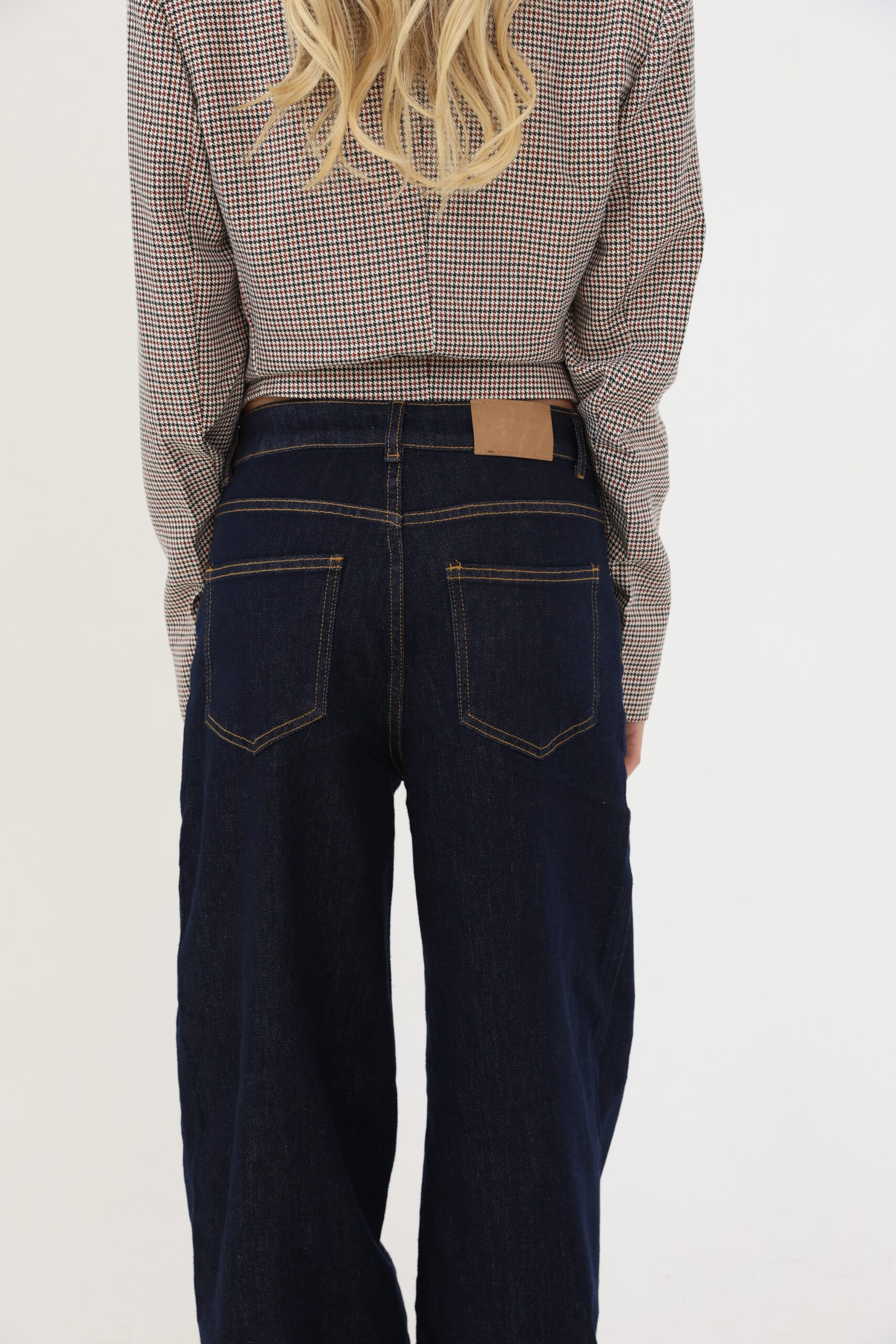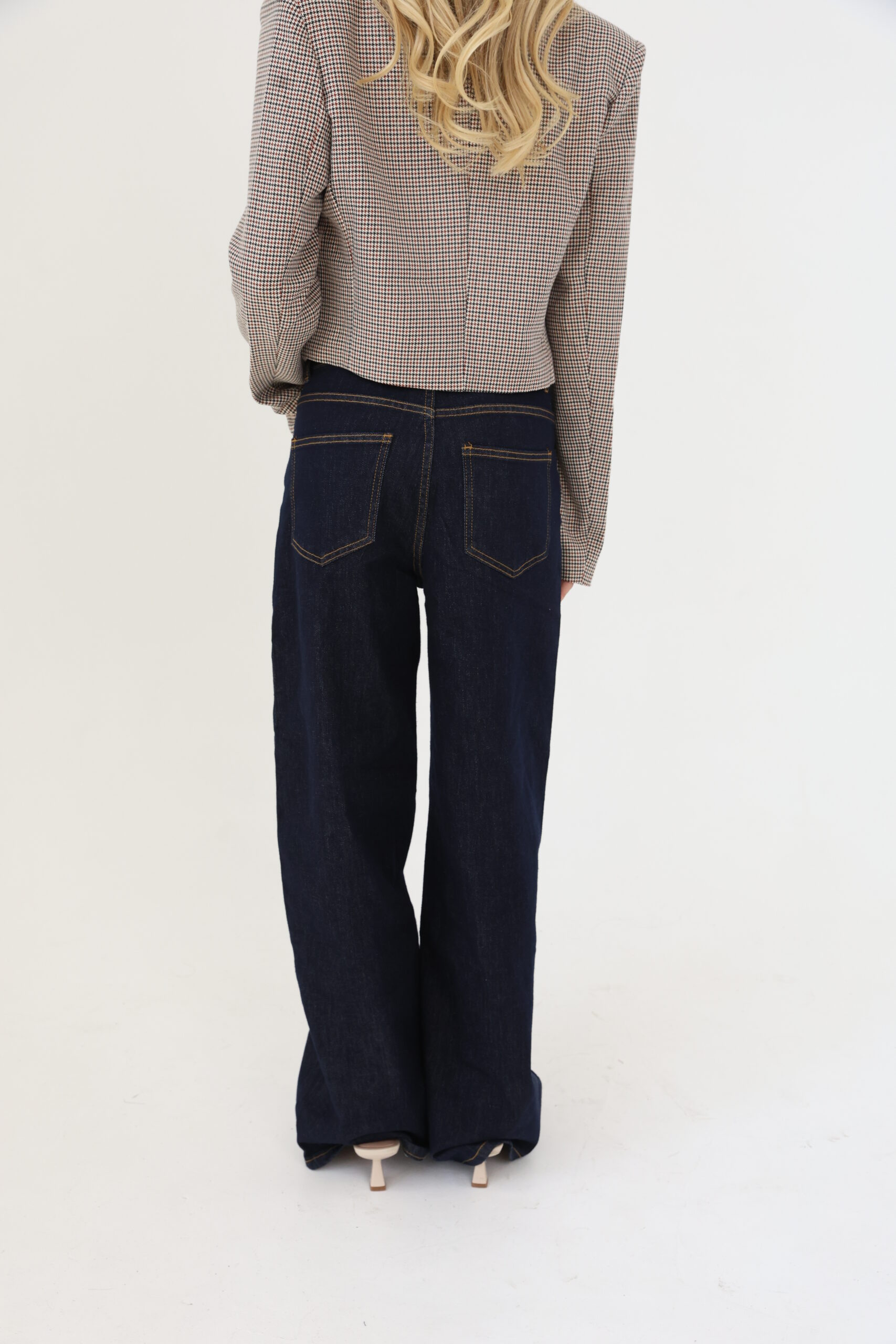 מכנס ג'ינס קלאסי, בצבע כחול כהה עם תפרים קונטרסטיים בולטים. מותן גבוהה וגימור ישר ונקי לאורך הרגל. מתאים לשילוב ביום יום עם טופ פשוט או עם בלייזר ללוק אלגנטי-קז'ואל.