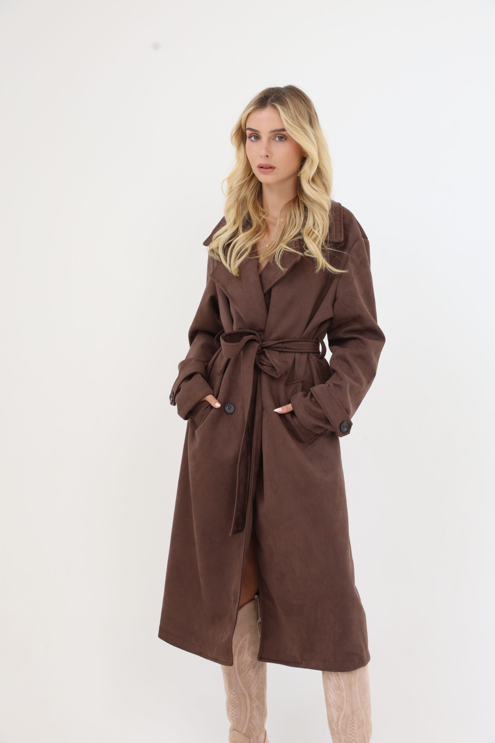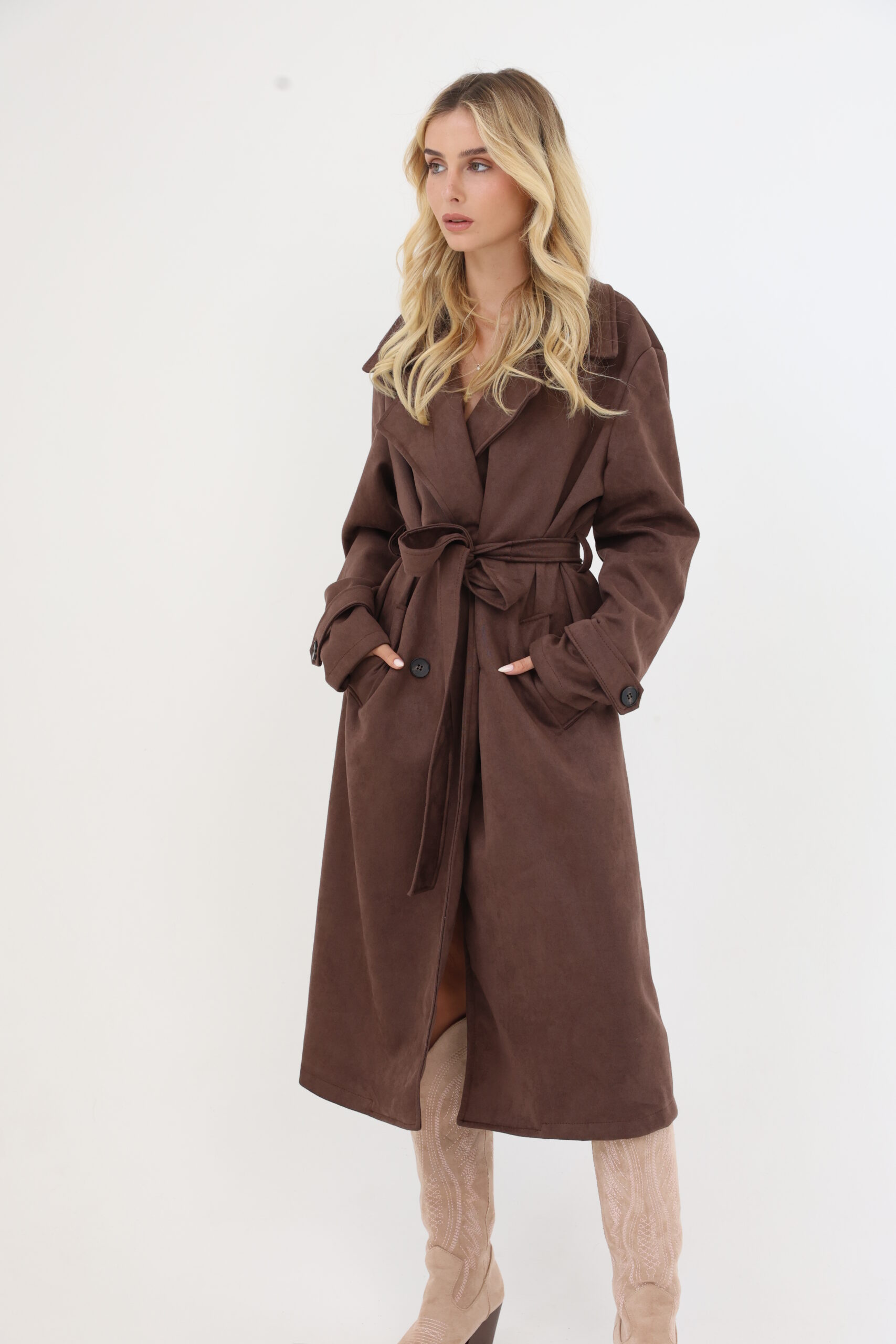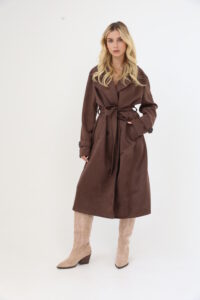 מעיל ארוך בגזרת טרנץ’ קלאסית, עשוי בד רך במראה זמש. סגירה עם קשירה במותן להדגשת הגזרה, כיסים קדמיים ופרטים עם כפתורים במראה מחויט.