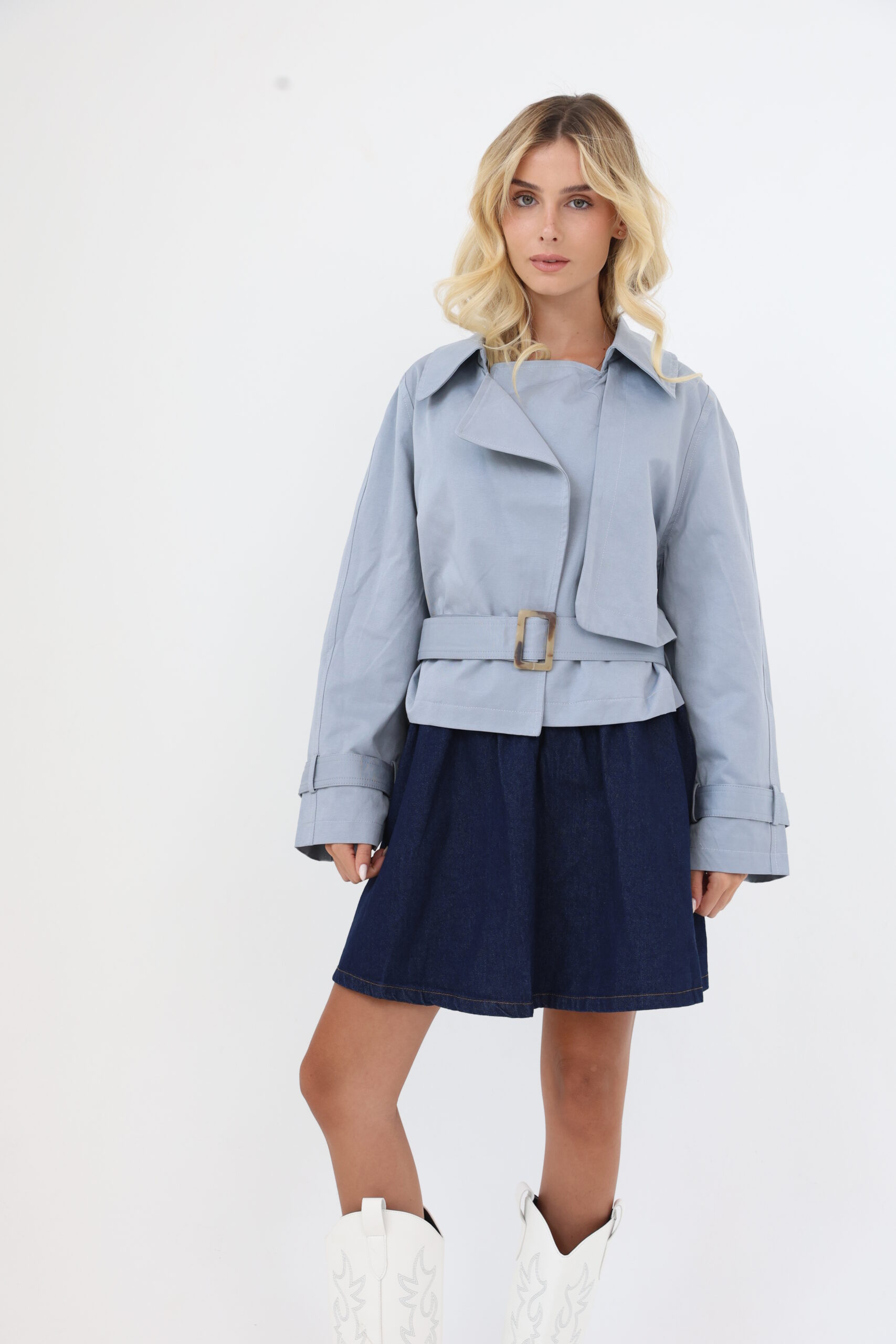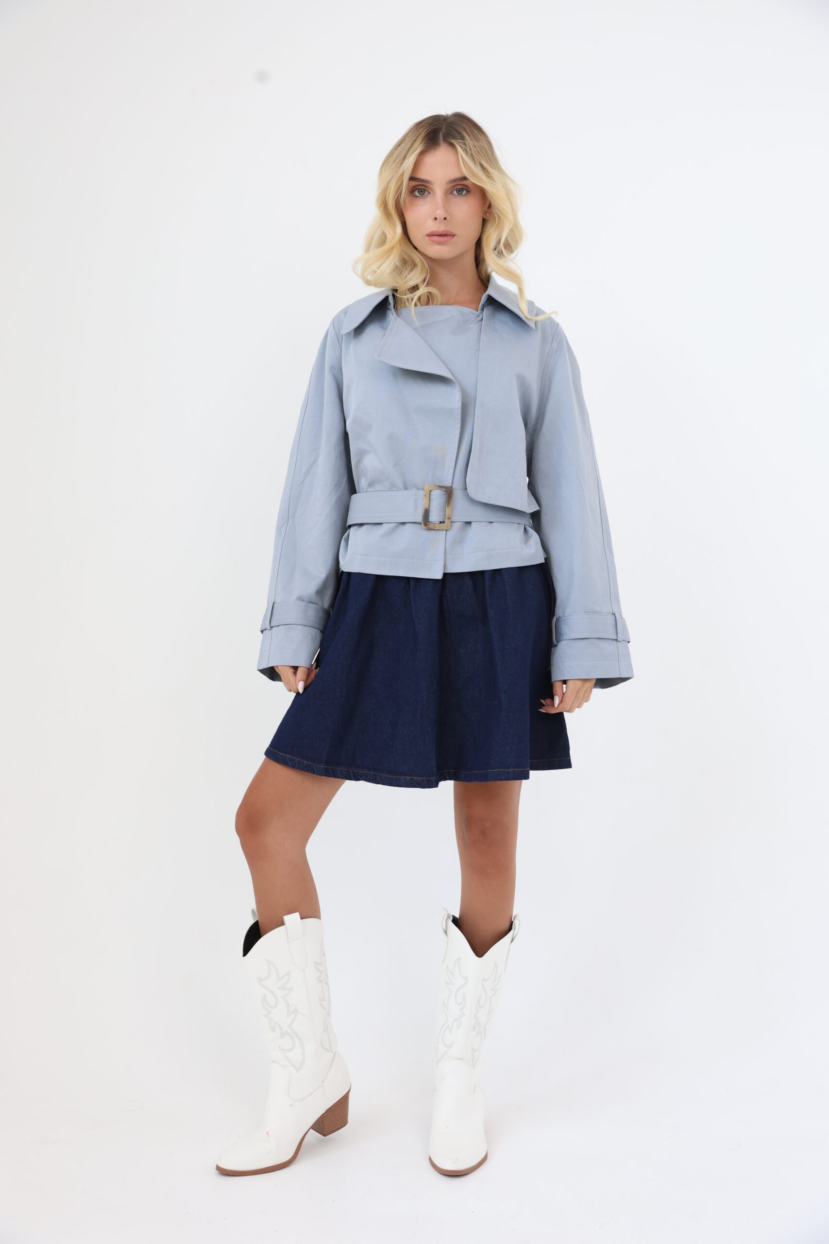 מעיל טרנץ’ קצר בצבע תכלת בהיר, בגזרה מחויטת עם צווארון קלאסי, חגורת אבזם במותן ושרוולים ארוכים עם רצועות קשירה להתאמה.