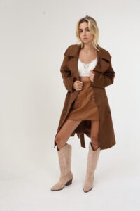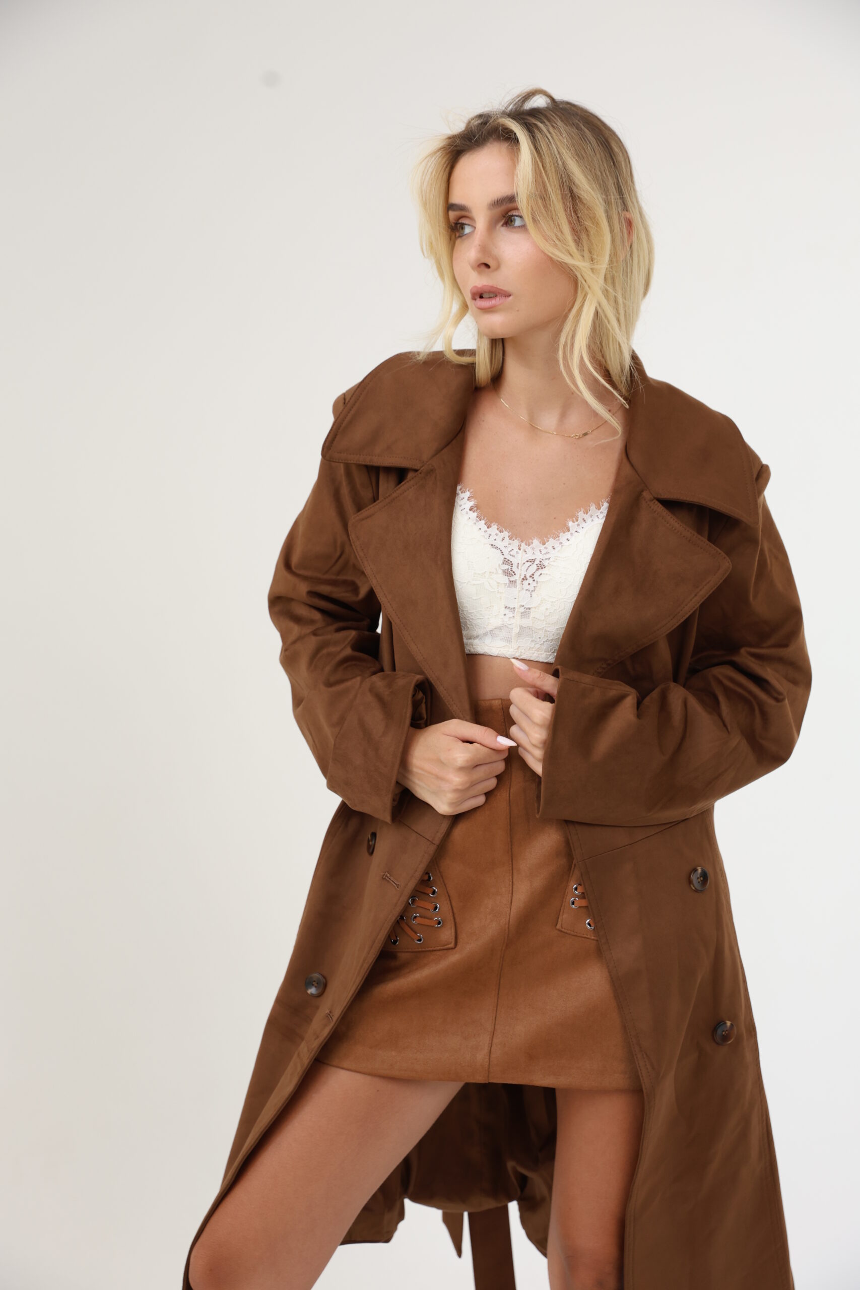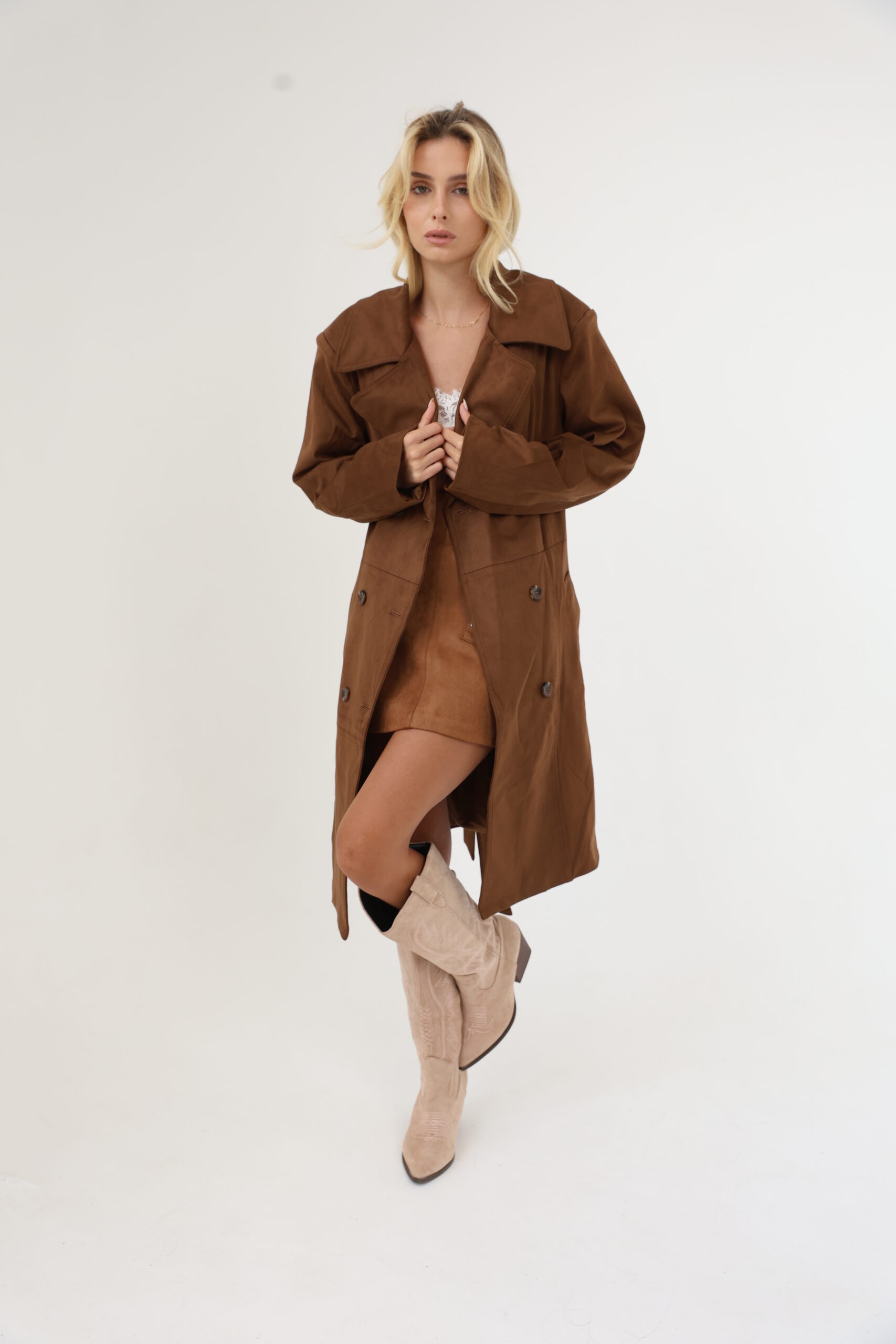 מעיל טרנץ' ארוך בגוון חום קמל, מבד סוויד רך ונעים למגע. בעל גזרה קלאסית עם דש רחב, כפתורי כפול וסגירת קשירה במותן ליצירת צללית מחמיאה. מתאים לשילוב מעל כל לוק, יומיומי או ערב, ומעניק מראה אלגנטי ויוקרתי עם טאץ' מודרני.