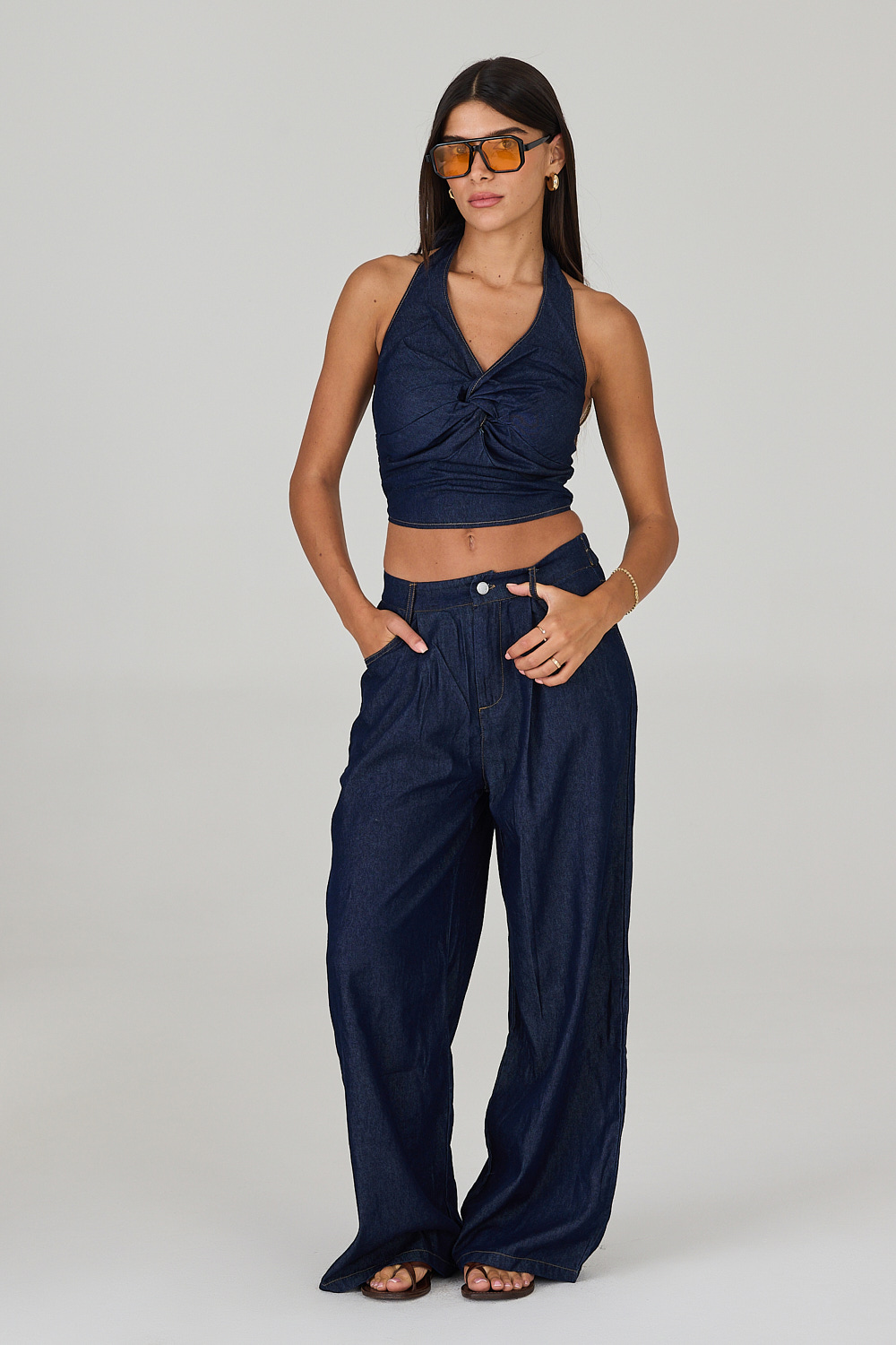 חליפת ג'ינס כהה מחטב גופייה מחטבת בגזרת קולר עם קשירה קדמית מחמיאה, בשילוב מכנסיים רחבים בגזרה גבוהה שמדגישים את המותן. הבד קל ונושם, מושלם למראה שיקי ונוח לאורך כל היום.