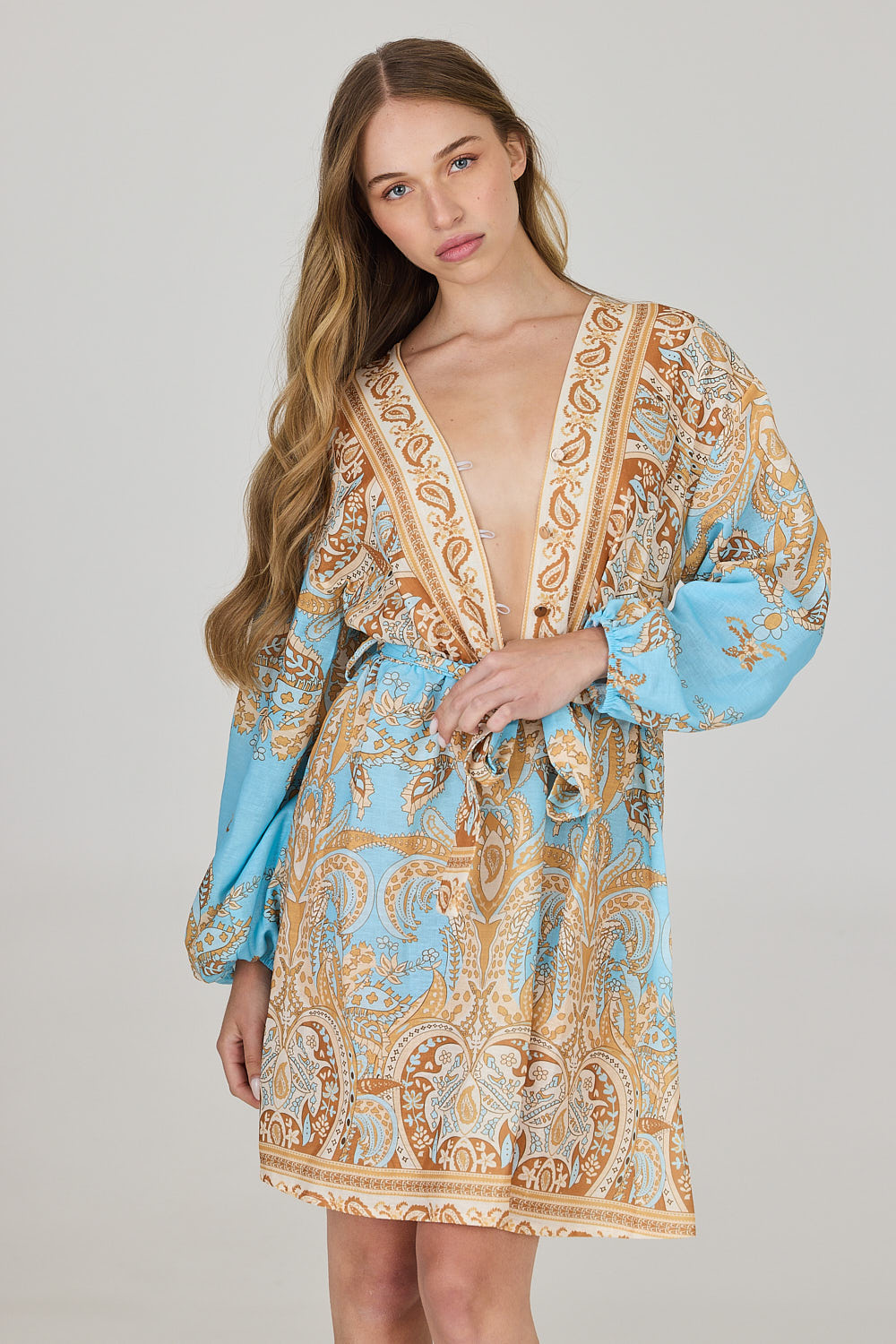 שמלה בוהו קצרה בהדפס אתני. שמלת מיני אוורירית מבד כותנה קליל ונעים, בגזרת מעטפת עם קשירה במותן. שרוולים ארוכים עם נפח קל, מחשוף וי עמוק עם סגירה פנימית נסתרת. זמינה בשלושה צבעים עם הדפסים אתניים: ירוק-ורוד, צהוב-כחול, תכלת-חום.