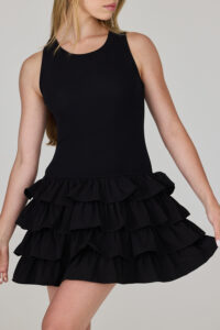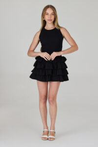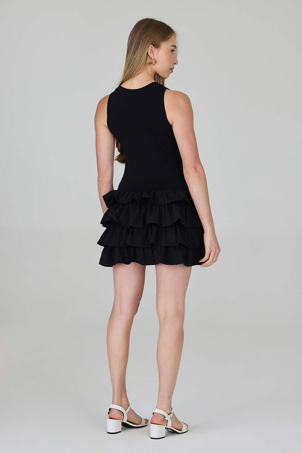 שמלה מיני שחורה בגזרת קומות עם נפח, בגימור פליסה.
