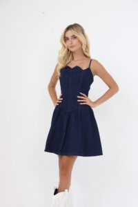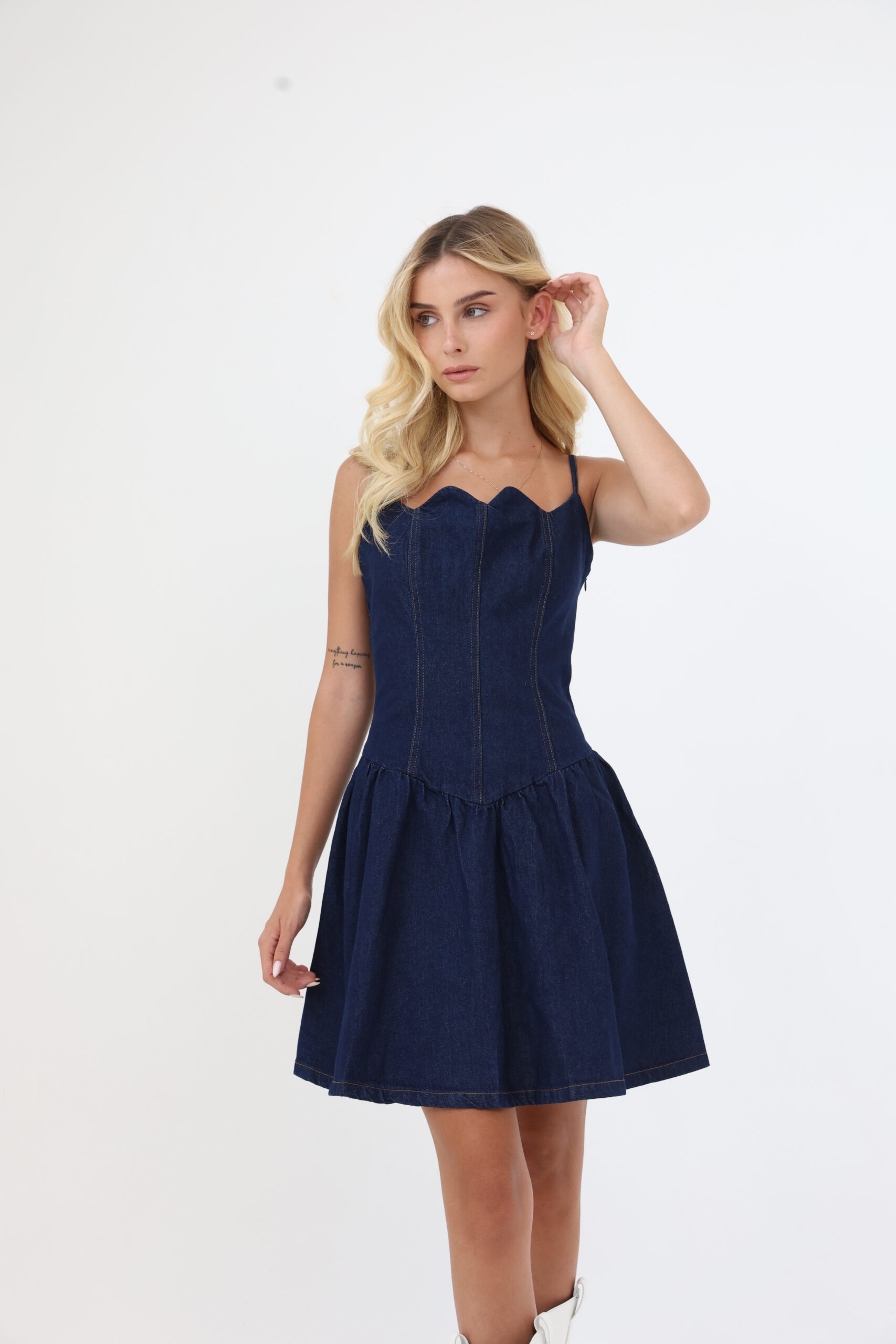 שמלה מיני בגזרת מחוך עם כתפיות דקות, עשויה ג'ינס כחול כהה עם תפרים דקורטיביים. חצאית בגזרת A מתרחבת ליצירת מראה קליל ונשי.