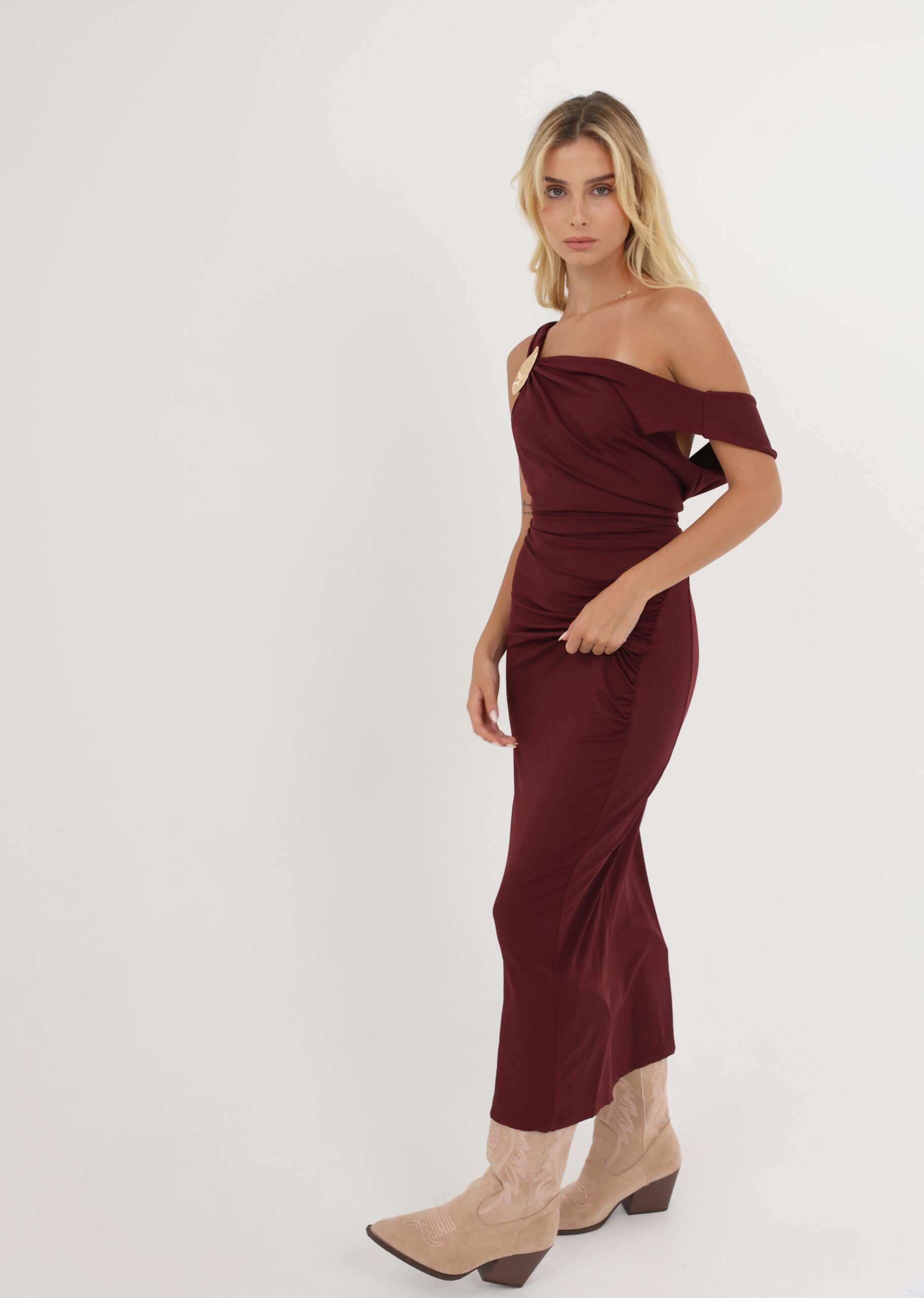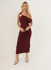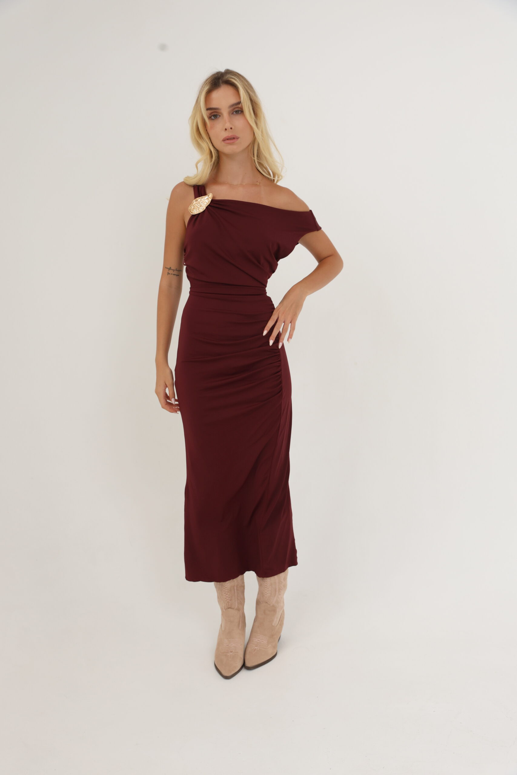 שמלה בגזרת מקסי א-סימטרית, עם כתף חשופה ועיטור מתכת מוזהב אלגנטי. עשויה בד נשפך ומחטב עם כיווצים בצד ליצירת מראה נשי ומעודן. מתאימה לאירועי ערב ולמראה מתוחכם.